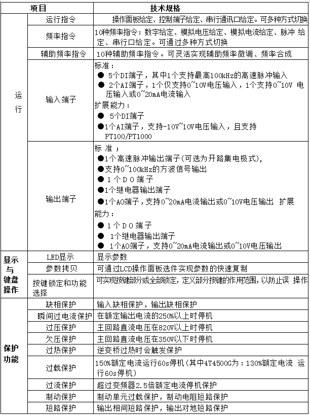 本系列变频器是一款通用高性能电流矢量变频器主要用于控制和调节 三相交流异步电机的速度和转矩。采用高性能的矢量控制技术低速高转矩 输出,具有良好的动态特性、超强的过载能力,性能稳定,保护功能强大, 人机界面简洁、操作简易。其广泛应用于工业领域、制造业、轨道交通、能源与动力行业、造纸、拉丝、机床、包装、食品、 风机、水泵及各种自动化生产设备的驱动。